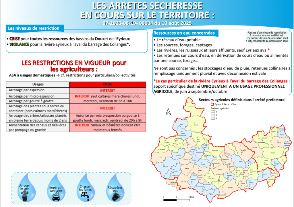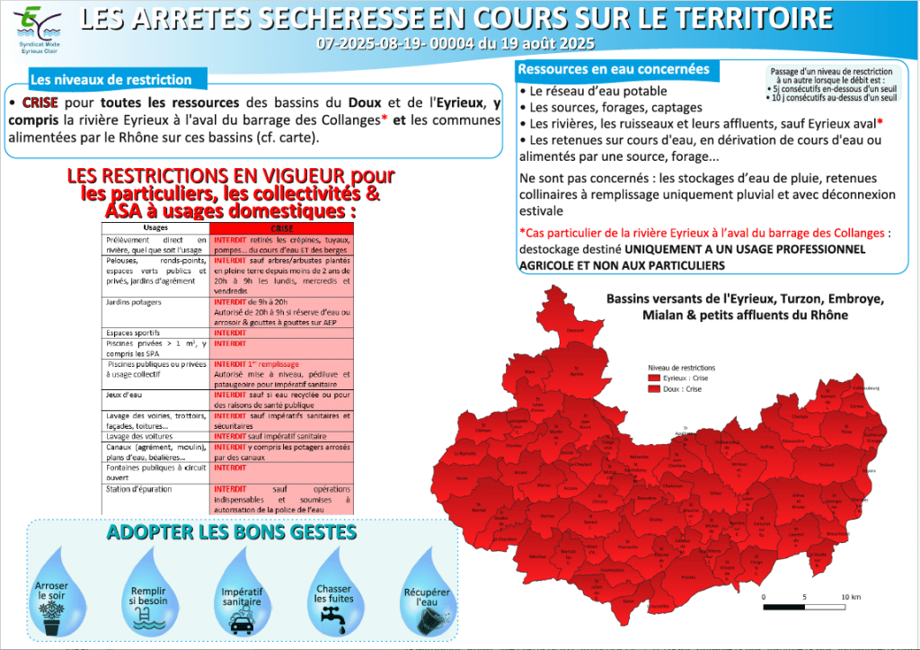 19 août 2025 : La préfète de l’Ardèche a pris un arrêté préfectoral maintenant le bassin de l’Eyrieux au niveau « CRISE » et imposant les limitations des usages de l’eau.